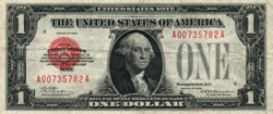 The $1 USN was introduced at around the same time as the FRBNs, and for somewhat similar reasons. Originally intended to serve as a supplement to the $1 SC which was then the only type of $1 note in circulation, it was found to be both unnecessary and impractical for the purpose: No shortage of $1 notes materialised, and if it had done, the law capping the total dollar value of USNs in circulation would not have allowed the $1 USNs to be issued quickly enough to alleviate it. Realising this, the Treasury called off the printing of $1 USNs less than a month after it had begun, and halted the issue of these notes after only a few thousand had entered circulation. (The remainder of the small printing remained in Treasury vaults until 1949, when it was decided that to issue the notes would be more efficient than to store them indefinitely. They were then released, over a period of several months, in Puerto Rico, in the hope that relatively few of them would find their way back to the mainland where their red seals might cause them to be mistaken for higher-denomination notes.) Except for the legal wording, which conformed to the other USNs, the $1 USN was identical in design to the contemporary $1 SC--though it did have the odd feature of carrying its type designation in two places, both above the portrait and around the legend and seal.
